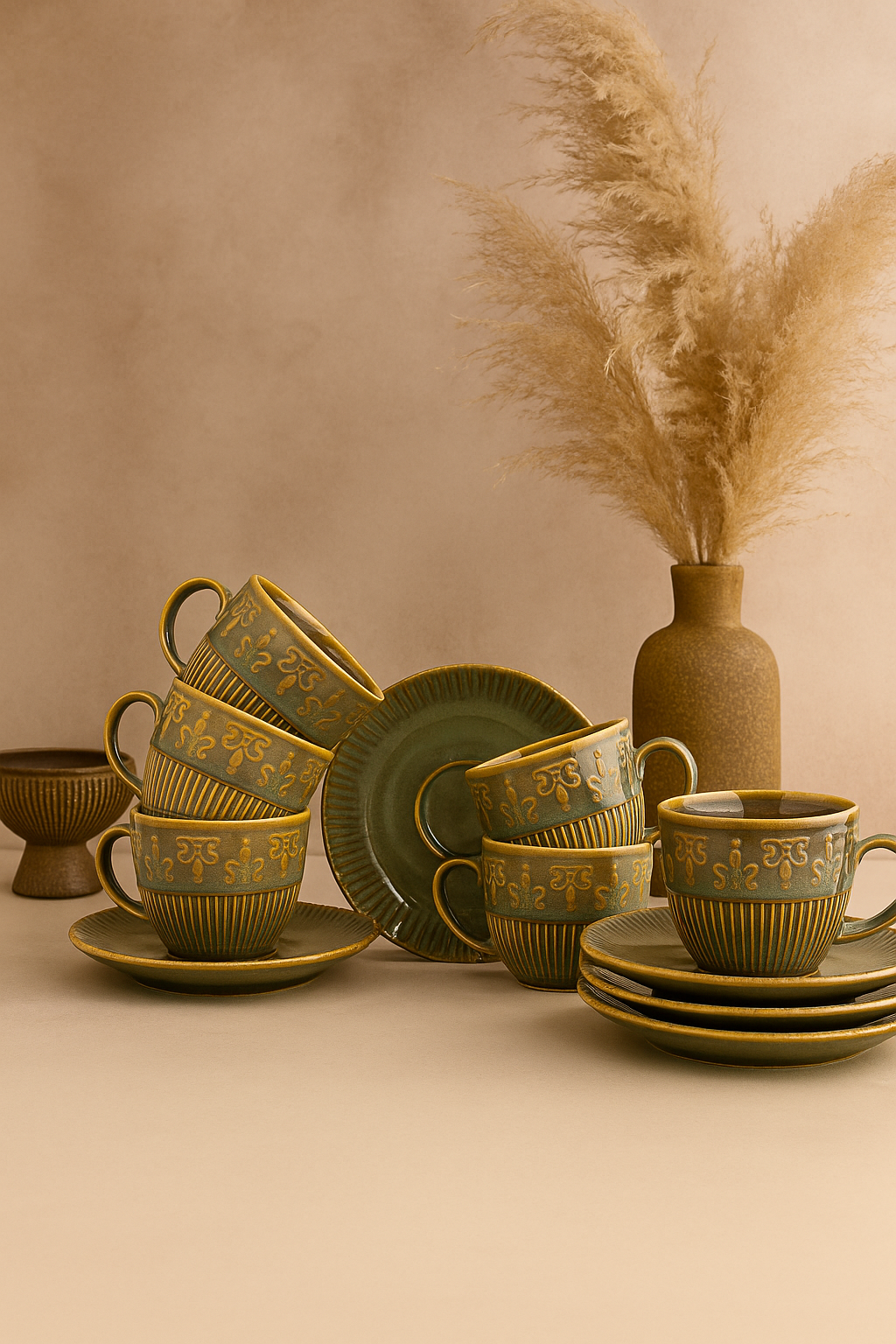 Her biri özenle üretilmiş 6 fincan ve 6 tabaktan oluşan bu takım, zarif desenleri ve el işçiliğini yansıtan dokusuyla sofralarınıza sıcak bir karakter kazandırır.